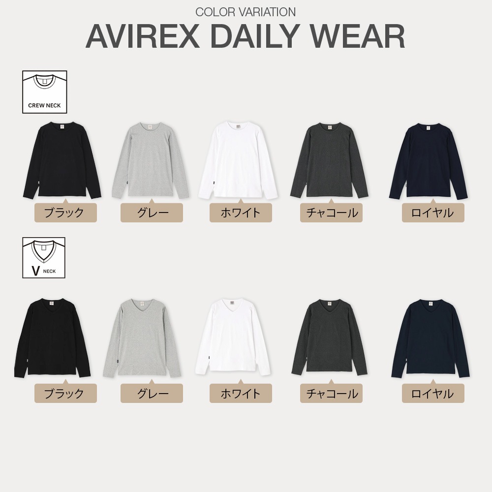![]() AVIREX 正規販売店 当店はアビレックス AVIREX の正規販売店です。 正規取扱店ならではの安心感とともに、信頼できる品質をお届けします。 Vネックとクルーネックを同時に選べる、アビレックス定番長袖Tシャツ 毎日着るものだからこそ、丈夫さと着心地の両立が重要です。 本商品は、アビレックス定番の「デイリーウェア」長袖Tシャツを、Vネックとクルーネックの2タイプセットでご用意しました。 当店限定特典 アビレックス定番Tシャツをご購入のお客様に、通常300円(税別)で販売しているエアフォースマスクをプレゼントいたします。 この機会だけの特典です。 本体には、テンションの強いライクラ糸を使用したリブ編み素材を採用。 体にしっかりフィットしながらも、快適なストレッチ感があり、長時間の着用でもストレスを感じにくい仕様です。 ヘビーローテーションでも型崩れしにくく、デイリー使いに適したタフさを備えています。 カラーはホワイト、ブラック、グレー、チャコール、ロイヤル(ネイビー系)を展開。 癖のないシルエットと配色で、1枚着としてもインナーとしても幅広く活躍します。 Vネックは浅めの設計で上品な印象に、クルーネックはスタンダードで安定感のある着こなしが可能。 シンプルな中にアビレックスならではのこだわりを感じられる、持っておくと重宝する定番アイテムです。 素材・生地 繊維強度に優れた上質な綿を使用したコーマ糸と、伸縮性に優れたスパンデックスを組み合わせたリブ素材。 柔らかな肌触りと、しっかりとした着心地を両立しています。 リブ編み仕様 1mm間隔で横糸にスパンデックスを入れた2×2リブ編み製法。 肉厚でフィット感があり、身体をやさしくサポートします。 抗菌防臭加工 生地に抗菌防臭加工を施し、汗のニオイや部屋干し臭を軽減。 ※すべての菌や臭いを除去・抑制するものではありません。 毎日の着用に安心して選べる1着。 今なら特典付きのため、ぜひこの機会にお試しください。 商品詳細 【特徴】体にしっかりとフィットする快適な適度な伸縮性、耐久性に優れたリブ素材 【素材】綿95%、ポリウレタン5% 【ブランド名】アビレックス AVIREX 【モデル名】DAILY WEAR RIB L/S V-NECK T-SHIRT リブ 長袖 ブイネック Tシャツ デイリーウェア、RIB L/S CREW NECK T-SHIRT リブ 長袖 クルーネック Tシャツ デイリーウェア 【カラーバリエーション】クルーネック-ブラック、クルーネック-グレー、クルーネック-ホワイト、クルーネック-チャコール、クルーネック-ロイヤル、Vネック-ブラック、Vネック-グレー、Vネック-ホワイト、Vネック-チャコール、Vネック-ロイヤル 【メーカー品番/JANコード】7834930018、6153480、617394、7834930019、6153481、617395 【生産国】ベトナム製/Made in Vietnam 【対象】大人・メンズ・男性用・レディース・女性用 【商品分類】Tシャツ、長袖Tシャツ、ロンT、ロングスリーブTシャツ、ロングスリーブ、VネックTシャツ、クルーネックTシャツ、カットソー、インナー、アンダーウェア、アンダーウエア、トップス、Tシャツ、長袖、ティーシャツ、肌着 【シーン】トップス、カジュアル、ビジネス、ミリタリー、ストリート、スポーツ、アウトドア、普段使い、おしゃれ、カッコイイ、運動、通勤、通学、スポーツ、ジム、フィットネス、トレーニング、最強Tシャツ、男の定番、プレゼント、彼氏、ギフト、筋トレ、マッチョ、丈夫、厚手、長持ち、透けない、タイト、伸縮性 |