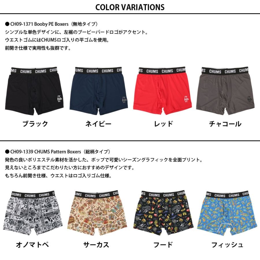 人気のCHUMSボクサーパンツを、無地タイプ(Booby PE Boxers)と総柄タイプ(CHUMS Pattern Boxers)の2種類からお選びいただけるページです。