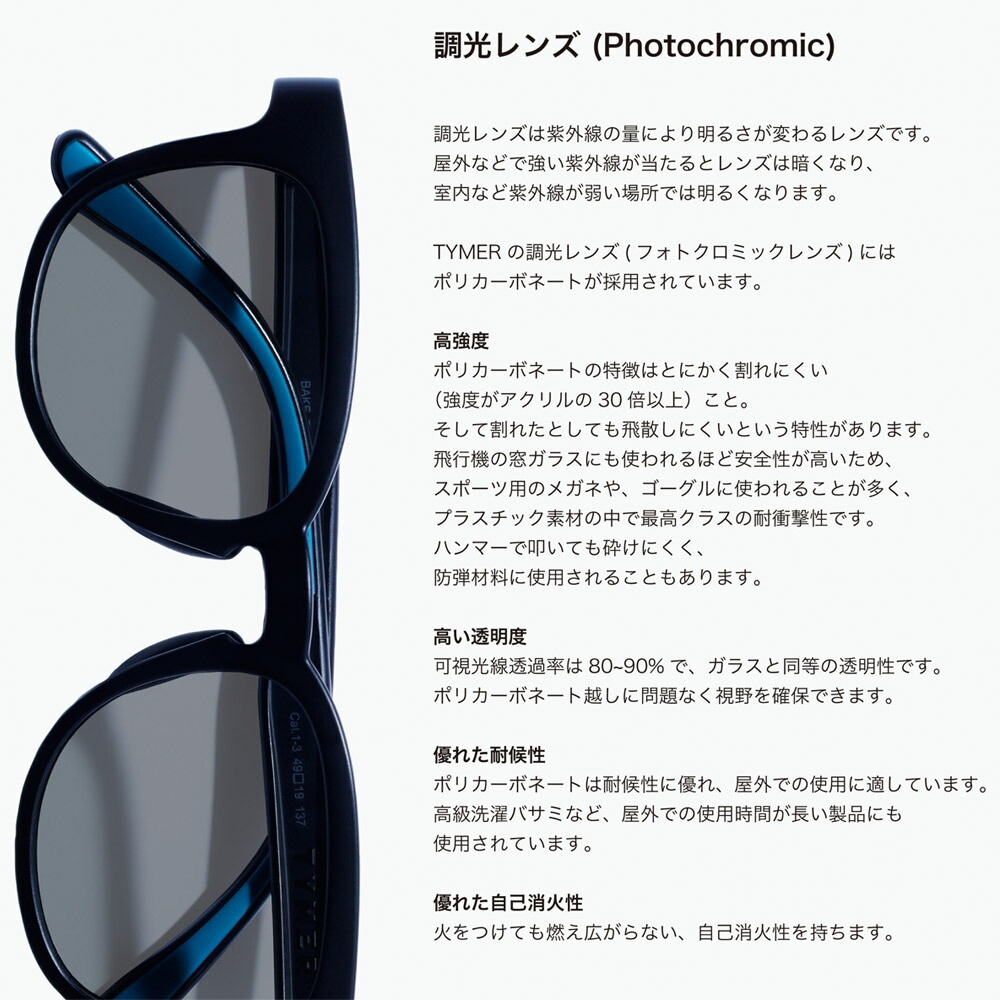 TYMERの調光レンズ(フォトクロミックレンズ) にはポリカーボネートが採用されています。